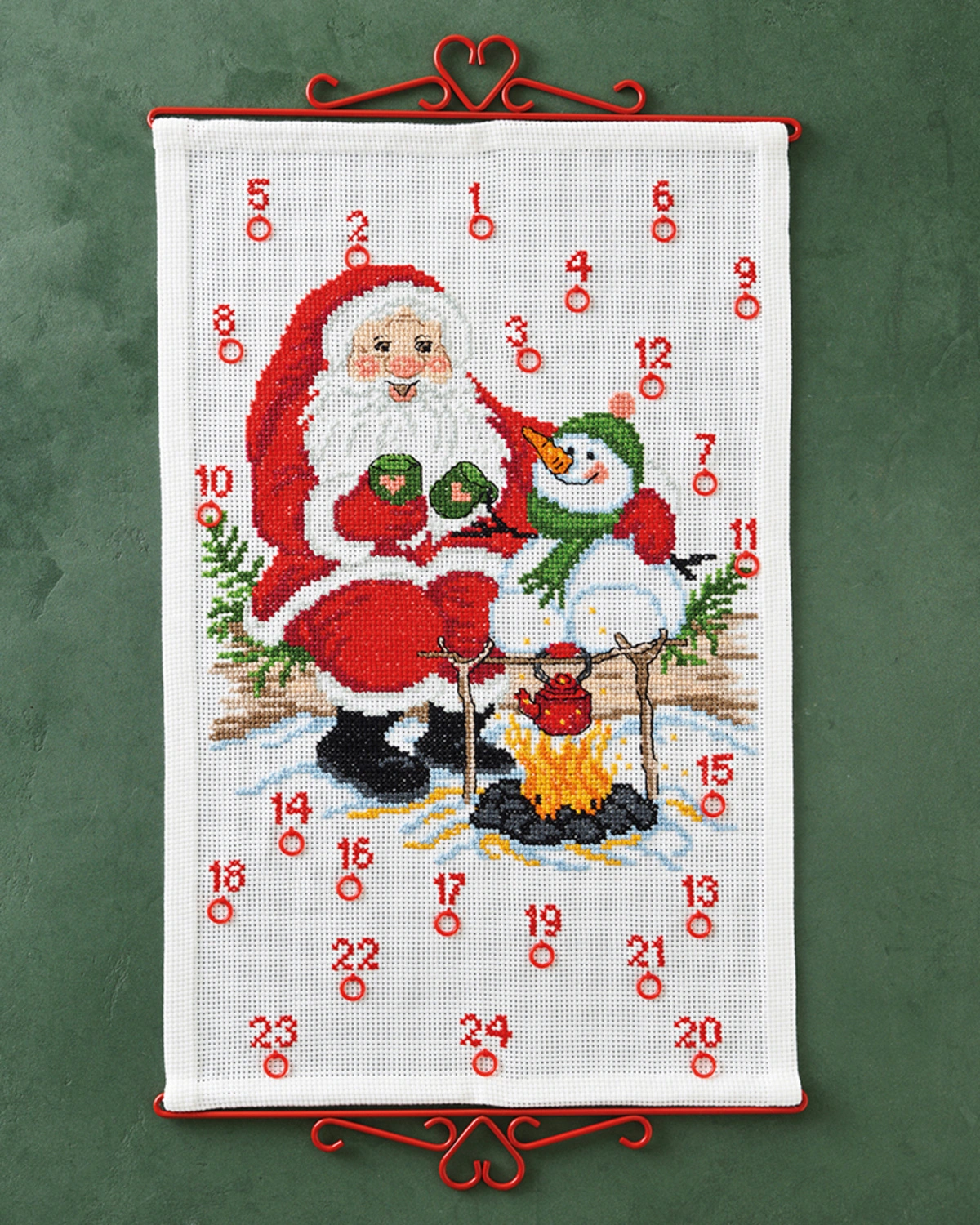 Julekalender broderi Julemand & Snemand ved bål, 38x59cm