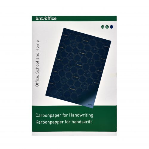 Blåt karbonpapir til håndskrift. Karbonpapir er et tyndt kalkerpapir, der bruges til at lave kopier. Det har en vokset bagside og giver et tydelig resultat. Det samme karbonpapir kan bruges flere gange. Denne variant er designet til håndskrift, men kan også bruges til skrivemaskiner. Hver pakke indeholder 10 ark i A4.