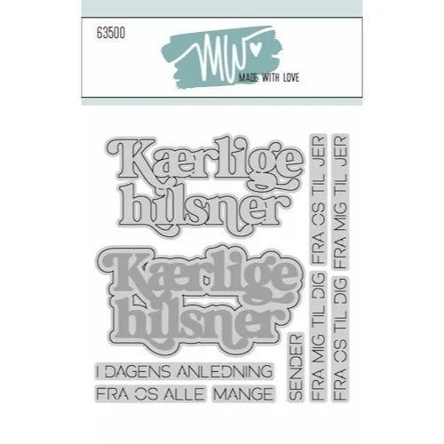 Kærlige hilsner fra Made With Love indeholder 10 dies: 1 kærlige hilsner tekst med skygge og 8 løse tekster. De løse tekster inkluderer: "I dagens anledning", "Fra os alle, "mange", "sender", "Fra mig til dig", "fra os til dig", "fra mig til jer" og "fra os til jer". Kærlige hilsner måler ca. 6,1x3,1 cm - skyggen ca. 6,4x3,4cm.