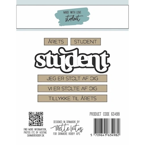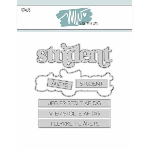 Student fra Made With Love indeholder 7 tekst dies: 1 stor student med skygge og 5 label tekster. Label teksterne er: "Årets", "Student", "Jeg er stolt af dig", "Vi er stolte af dig" og "tillykke til årets". Student måler ca. 7,8x2,5 cm - skygge ca. 8,1x2,8 cm.