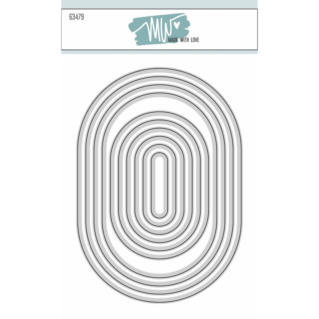 Basic Ovals 2 fra Made With Love indeholder 10 ovale dies. 4 i A6 format og 6 i A7 format. Den største A6 måler 10x14,3 cm og den største A7 er 6x9 cm. Kombiner med Basic Ovals 1 (63478) for at kunne lave helt tynde rammer eller lag.